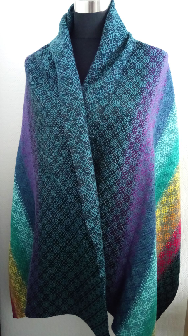 Kangaspuissa käsinkudottu "Rainbow Dreams"- shaali/ huivi, petrooli.
